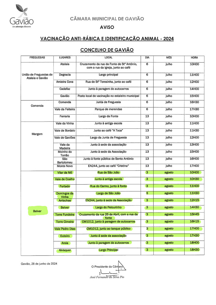 Calendário de vacinação anti-rábica na freguesia